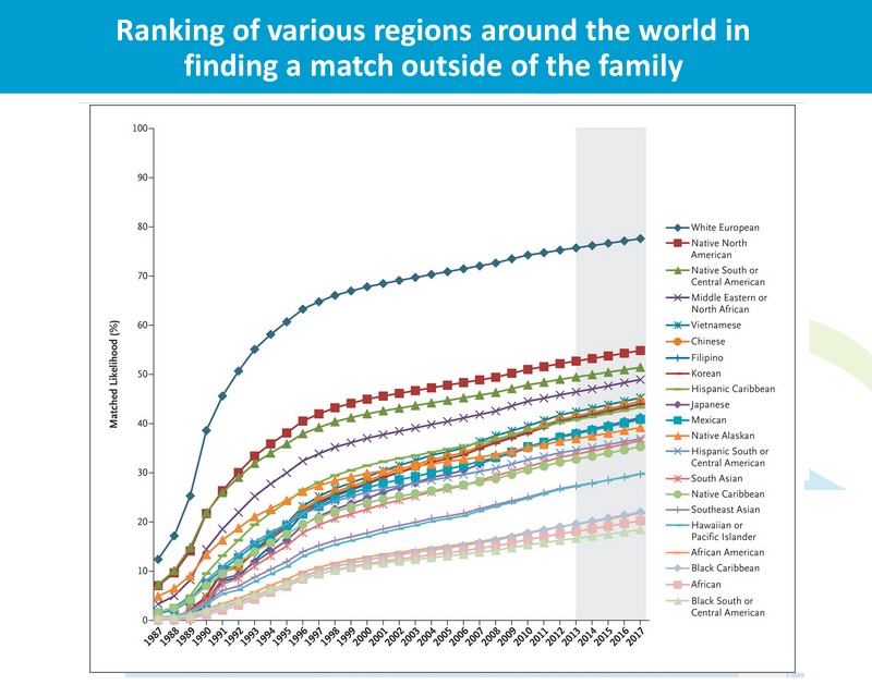 The discrepancy is stark. While whites have an 80% chance of a match, if you are African American, or Black Caribbean you have about a 15% chance of finding a match (in 2017). You have a 25% chance of a match with a sibling.